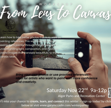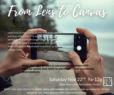 Description: This workshop helps artists bridge the gap between photography and painting by learning how to take, select and interpret photos that make strong paiting refences. Students will learn to look for light, composition and design rather than simply copying what they see in a photo