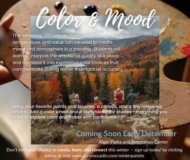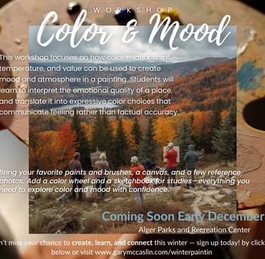 Together, we’ll explore topics like capturing mood and color, designing strong compositions, painting from photos, and transforming sketches into finished works — all while nurturing the deeper connection between artist, place, and moment.
